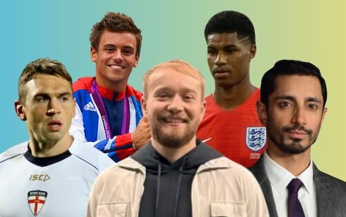 Tom Daley: Jim Thurston, CC BY-SA 2.0; Marcus Rashford: Oleg Bkhambri (Voltmetro), CC BY-SA 4.0, via Wikimedia Commons; Kevin Sinfield: Gerard Barrau, CC BY-SA 3.0, via Wikimedia Commons; Billy Monger: @billymongerracing via Instagram; Riz Ahmed: Red Carpet Report on Mingle Media TV from Culver City, USA, CC BY-SA 2.0, via Wikimedia Commons