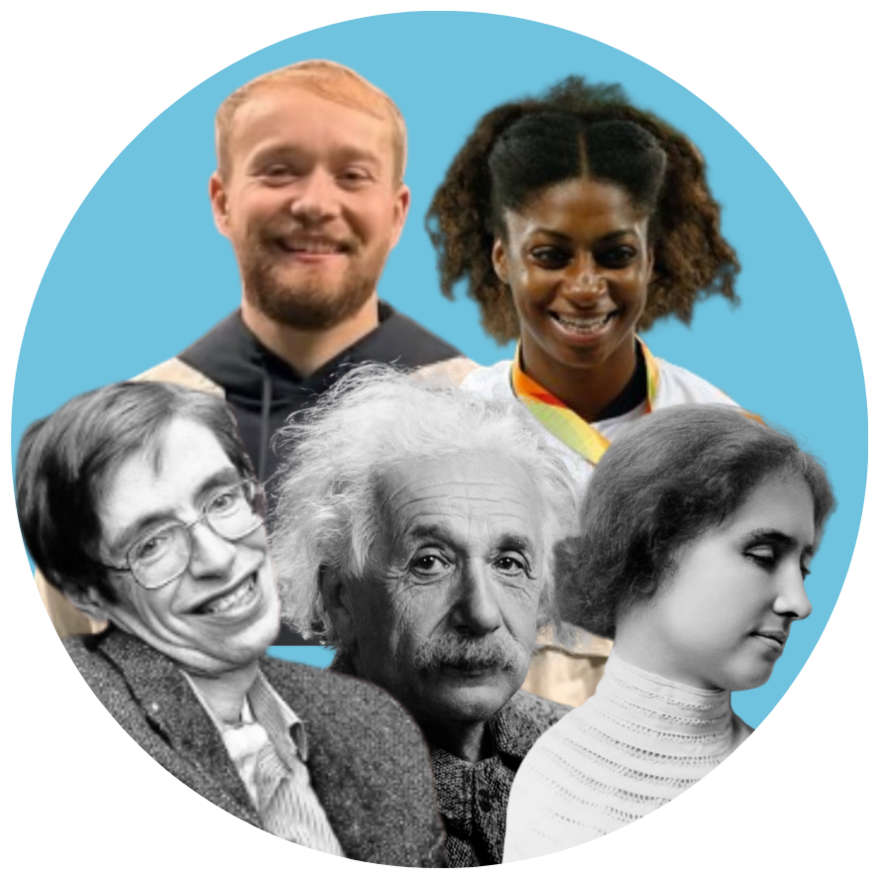 Billy Monger: @billymongerracing via Instagram; Kadeena Cox: Fernando Frazão/Agência Brasil, CC BY 2.0, via Wikimedia Commons; Helen Keller: Public domain via Wikimedia Commons; Albert Einstein: Photograph by Orren Jack Turner, Princeton, N.J. Modified with Photoshop by PM_Poon and later by Dantadd., Public domain, via Wikimedia Commons; Stephen Hawking: NASA, Public domain, via Wikimedia Commons